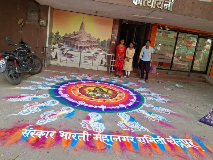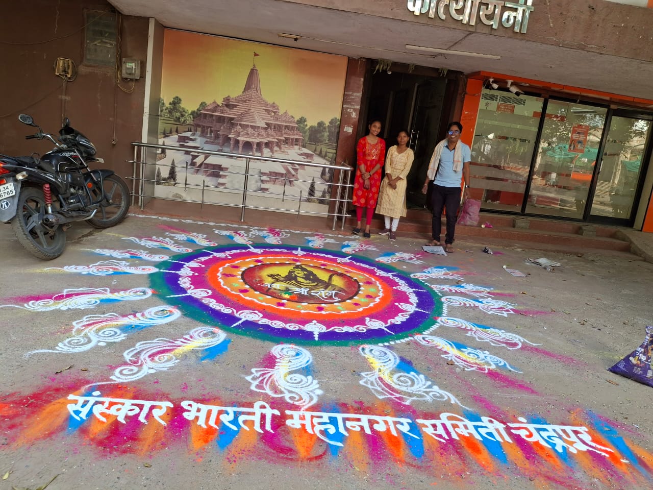 चंद्रपूरात श्री रामनवमी निमित्त निघालेल्या भव्य शोभयात्रेत संस्कार भारती चंद्रपूर शाखेतर्फे काढण्यात आलेली भव्य रांगोळी रामभक्तांचे लक्ष वेधून घेत आकर्षणाचे केंद्र ठरली.